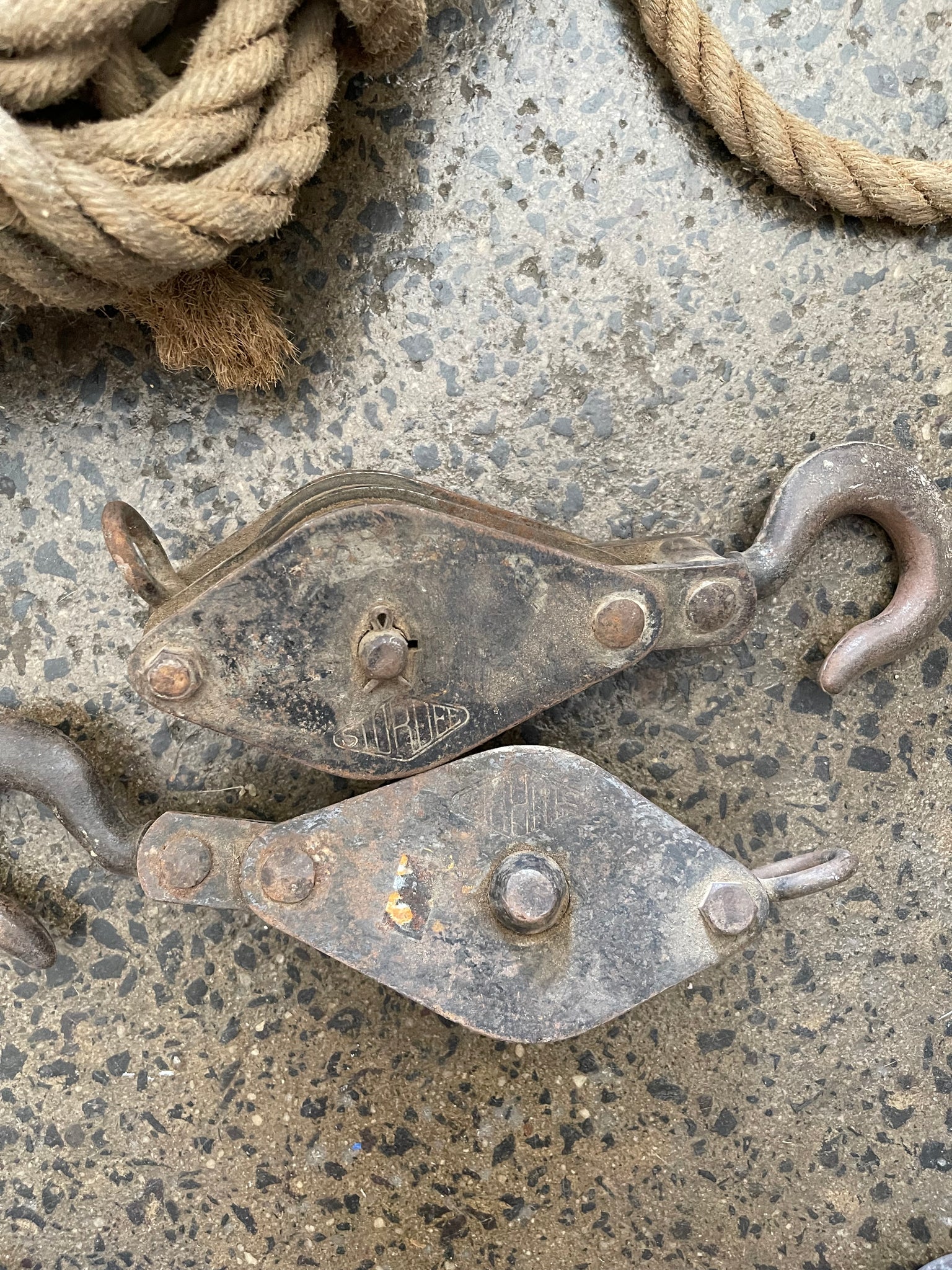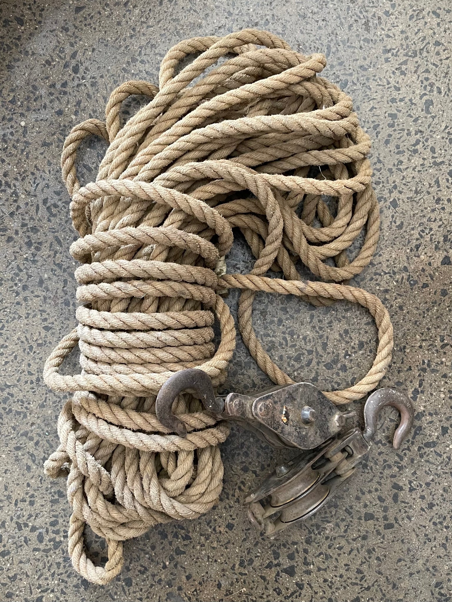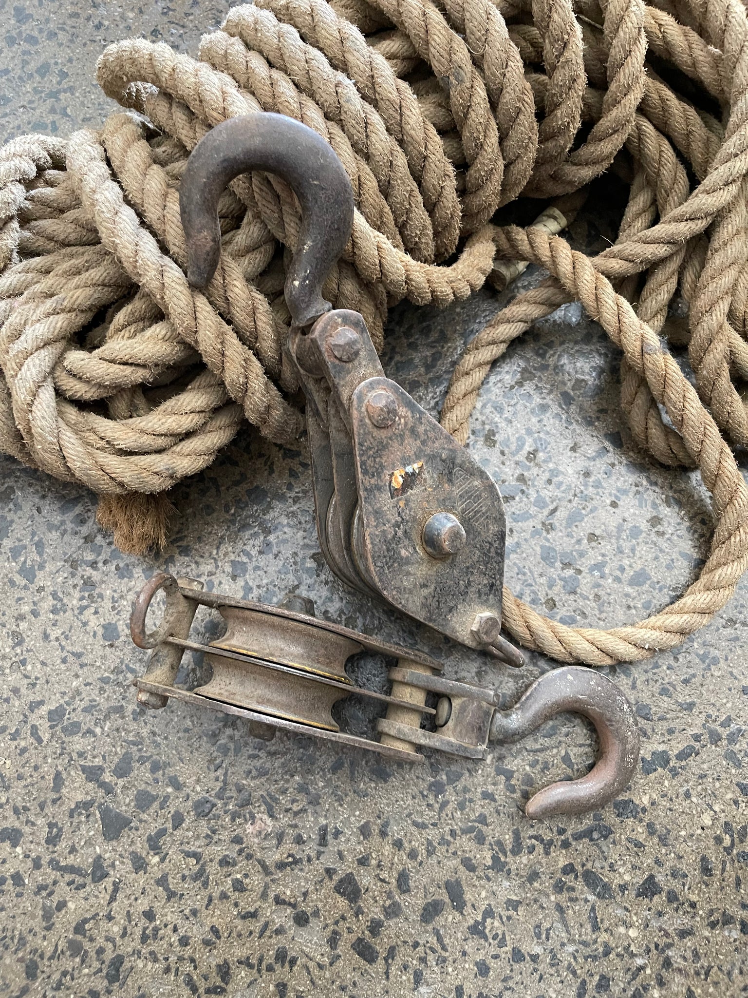 Two Vintage double wheeled cast iron Sheave Blocks with hook with a long length of rope Tackle.