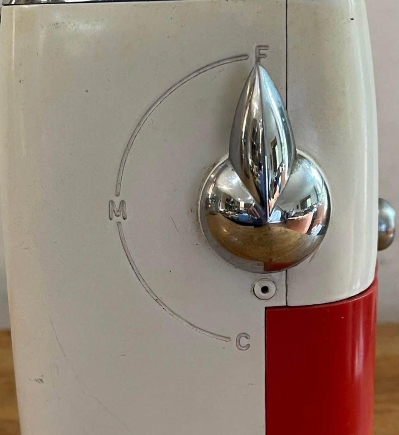Manual hand cranked ice crusher made in Sydney around 1950. The handle rotates the blades inside and the crushed ice collects in the pull out drawer. Ice is crushed to Fine, Medium or Coarse depending on your cocktail’s recipe. Perfect for a retro bar. Red and chrome.